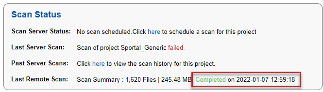 To view the status of the import of scan results into your Code Insight project from the most recent remote scan run for your project, navigate to the project’s Summary page. In the Scan Status section, locate the status and timestamp of the import. (For a description of these remote-scan details, see the “Summary Tab” topic under “Code Insight User Roles and Permissions” section in the Code Insight User Guide.)