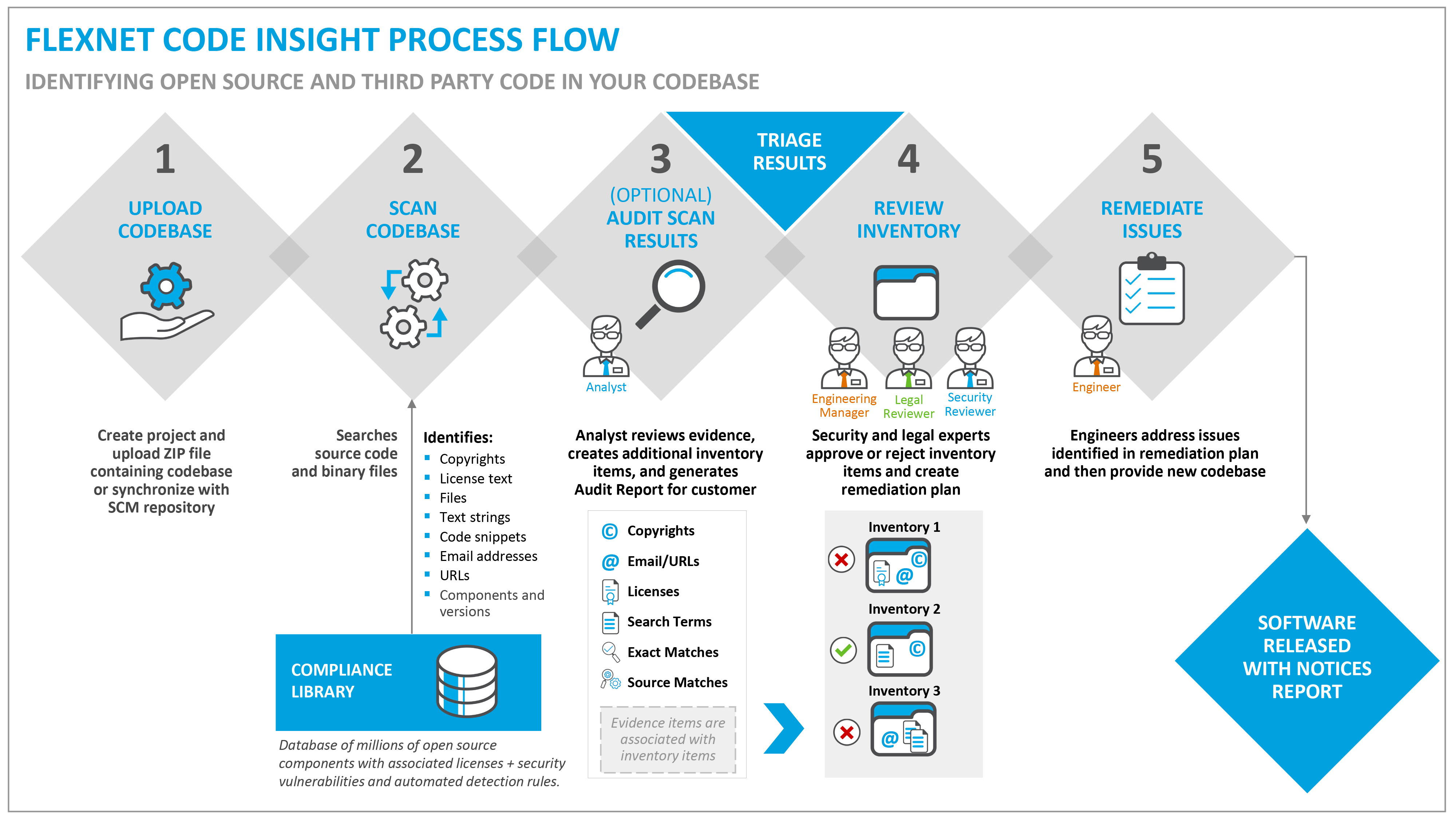 | 5 | Remediate Issues | Engineering | Engineering addresses remediation plan to resolve all rejected inventory items, and delivers new version of the codebase. Codebase is rescanned until it is approved for release. | See Performing Remediation. |