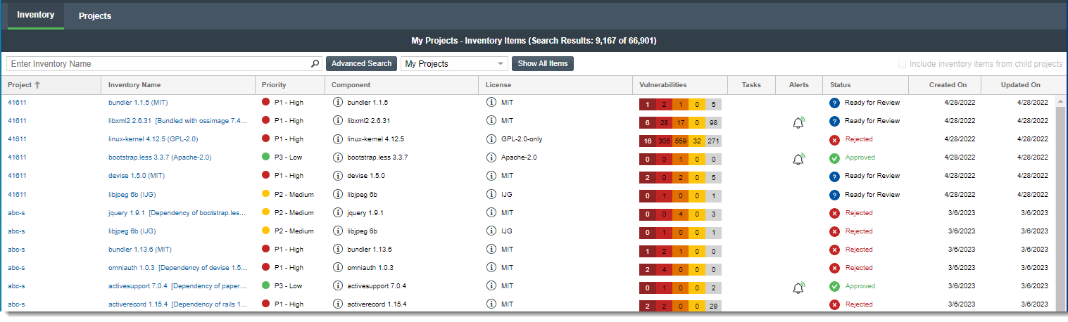 • From the Code Insight dashboard (which is displayed when you start Code Insight), click view inventory. See Opening Code Insight for details on accessing this dashboard.